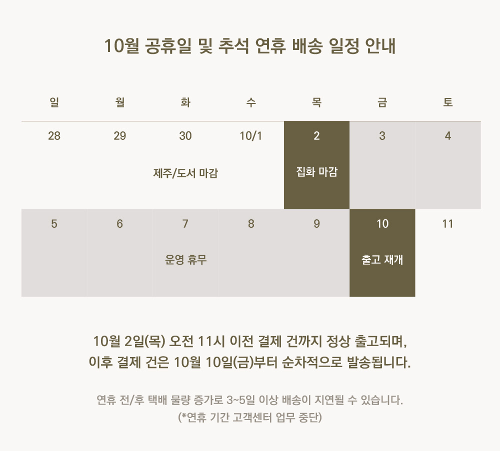 10월 2일 정오(12시) 이후의 결제 건은 10월 10일부터 순차 출고될 예정이오니