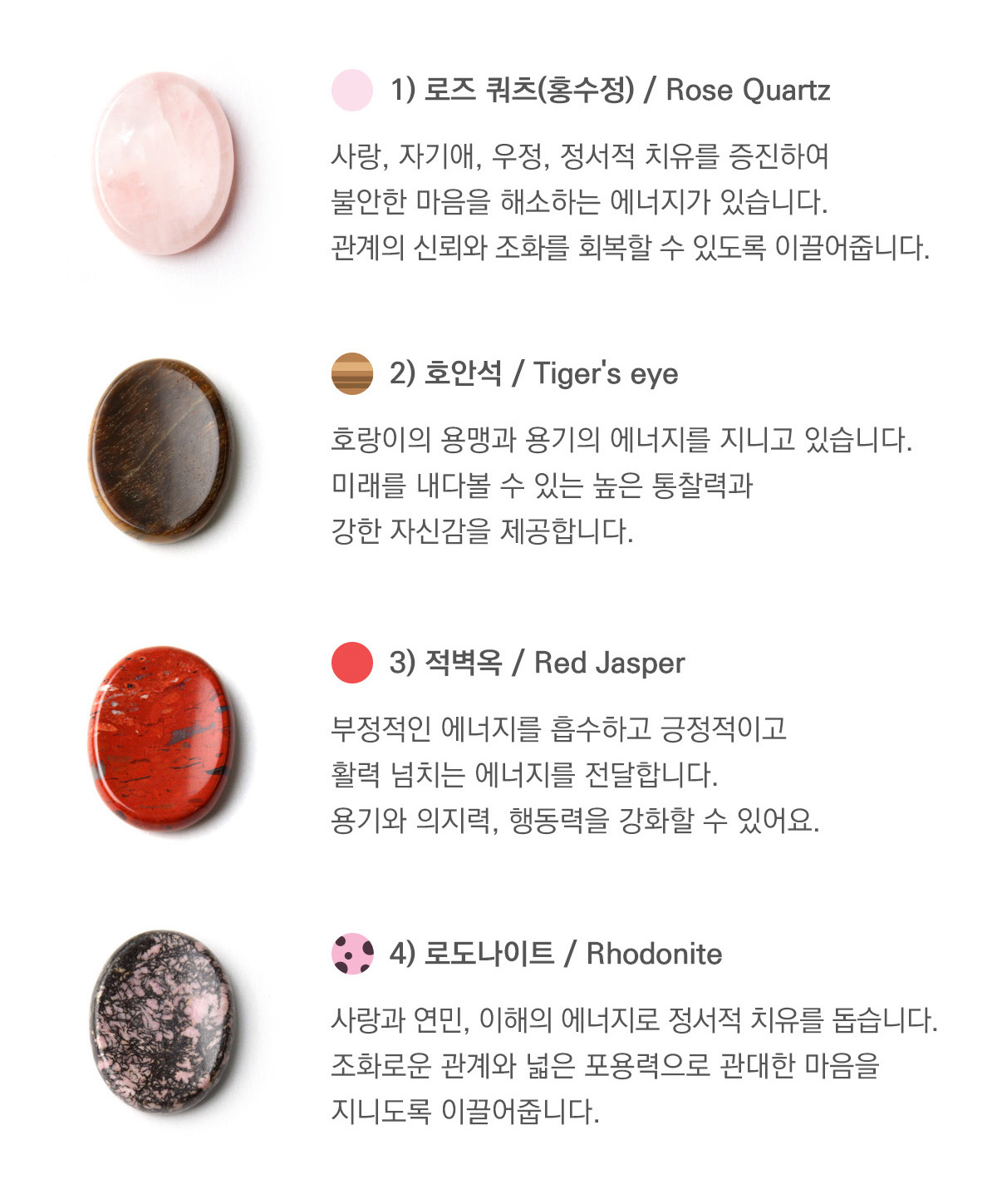 - '로즈 쿼츠'는 사랑, 자기애, 우정, 정서적 치유를 증진하여 불안한 마음을 해소하는 에너지가 있습니다. 관계의 신뢰와 조화를 회복할 수 있도록 이끌어줍니다.