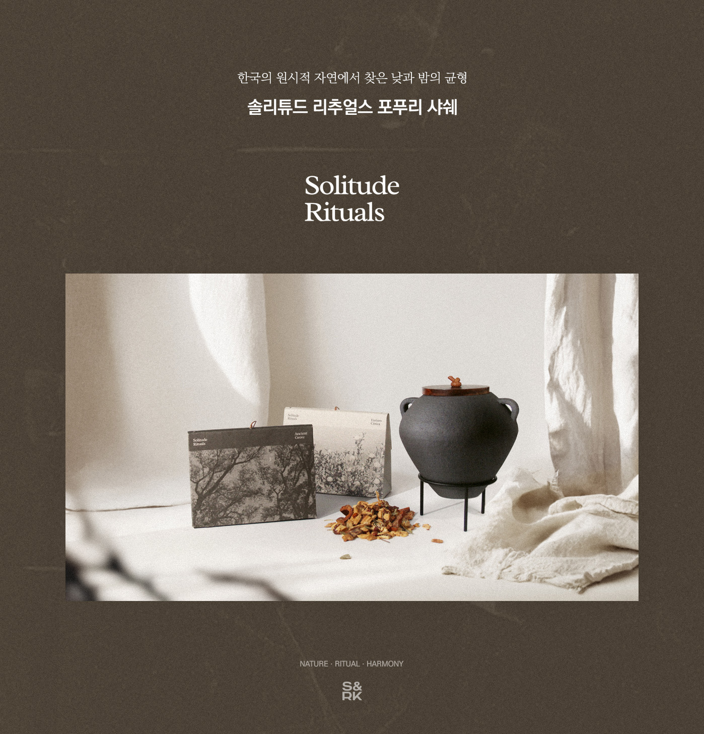 솔리튜드 리추얼스는 한국의 고요한 자연에서 찾은 깊이 있는 향으로 낮과 밤이 반복되는 일상에 균형있는 에너지를 제공합니다.